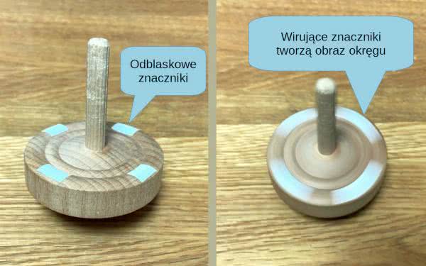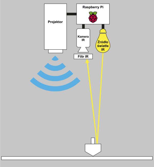 Układ składa się z dwóch zasadniczych elementów – kamery podczerwonej z oświetlaczem i filtrem oraz projektora. Oba elementy podłączone są do komputera jednopłytkowego Raspberry Pi, jak pokazano na rysunku 2. Kamera i projektor muszą być względem siebie nieruchome, aby możliwa była translacja pozycji, wykrywanej przez kamerę, na lokalizację na obrazie, wyświetlanym przez projektor. Źródło podczerwieni oświetla całą powierzchnię poniżej układu. Na wierzchniej stronie bączka przyklejone są odblaskowe kawałki reflektora działające w podczerwieni. Obracając się, zlewają się one w jeden okrąg, jak widać to na fotografii 1. Kamera rejestrująca tylko promieniowanie podczerwone, obserwując scenę, wykrywa światło odbite od reflektorów, dzięki czemu, jak pokazano na rysunku 3, elementy z przyklejonym reflektorem, jak bączek, są wyraźnie widoczne na obrazie.
