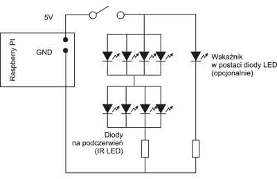 Na rysunku 4 pokazano schemat połączenia diod w oświetlaczu. Diody połączone są równolegle po cztery, a następnie szeregowo. To optymalny sposób wykorzystania napięcia zasilania 5 V. Szeregowo z diodami dołączony jest rezystor, którego zadaniem jest stabilizacja prądu diod. Opornik trzeba dobrać do zastosowanych diod, pamiętając, że płynący prąd to czterokrotność prądu znamionowego jednej diody (z uwagi na połączenie równoległe), a spadek napięcia na diodach jest dwukrotnością spadku na pojedynczej diodzie, z uwagi na połączenie szeregowe dwóch LED (efektywnie). W przypadku typowej diody IR LED (5 mm; 850 nm; Optosupply OSRICA5B31A) prąd diody wynosi 20 mA, a spadek napięcia typ. 1,4 V. Dla takiego elementu konieczne jest dobranie opornika o rezystancji zbliżonej do 27,5 Ω, na przykład 30 Ω czy nawet 33 Ω – rekomendowana jest raczej wyższa wartość niż wyznaczona, aby nie przekroczyć rekomendowanego prądu diody (20 mA), nawet gdy napięcie zasilania wzrośnie powyżej 5 V lub któraś z diod będzie wykazywała niższy spadek napięcia niż typowa wartość.