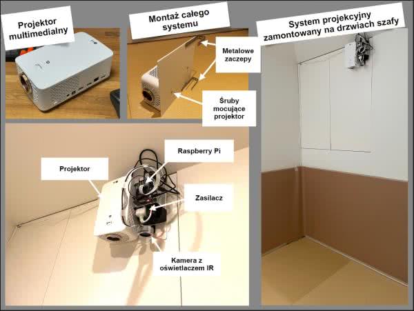 W pierwszym kroku trzeba zmontować wszystkie elementy razem – projektor wraz z Raspberry Pi i z kamerą z oświetlaczem. Następnie moduł można zamontować na ścianie lub tak jak autor na drzwiach szafy. To drugie rozwiązanie wydaje się bardzo wygodne, gdyż pozwala na zdejmowanie i zakładanie systemu w dowolnym momencie.