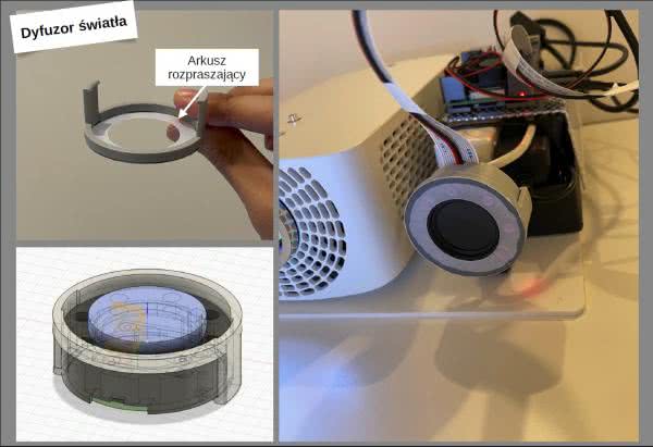 Zintegrowany moduł do obrazowania zaprojektowany został w Fusion360 i wydrukowany na drukarce 3D. Integruje on w sobie centralnie umieszczoną kamerę oraz wianuszek ośmiu podczerwonych diod LED, umieszczonych dookoła niej. Moduł ma także miejsce na umieszczenie filtra podczerwonego, który ogranicza światło docierające do kamery. Na fotografii 2 pokazano moduł kamery wraz z elementami składowymi. Diody LED oświetlacza zasilane są z napięcia 5 V z Raspberry Pi.