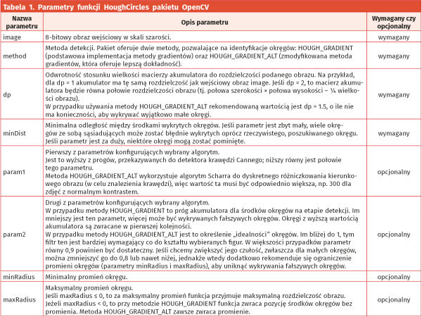 Funkcja HoughCircles() z biblioteki OpenCV to implementacja metody gradientów Hougha, która jest przeznaczona do wykrywania, w przypadku tej funkcji, okręgów. W ogólności transformacja Hougha to metoda używana w systemach widzenia komputerowego do wykrywania kształtów, które można opisać analitycznie – prostych, okręgów itp. Dokładny opis matematyczny tej funkcji wykracza poza ramy tego artykułu, więc do zrozumienia kodu wystarczy nam opis parametrów, z jakimi uruchamiana jest funkcja: