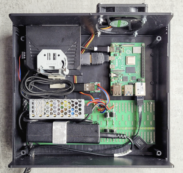 Do zasilania potrzebny będzie zasilacz napięciu wyjściowym +5 V i wydajności prądowej 3 A. Teoretycznie można do tego celu zastosować ładowarkę do telefonu, ale takie urządzenie nie jest przewidziane do ciągłej pracy. Postanowiłem zastosować przetwornicę o nominalnym napięciu wyjściowym 12 V przeznaczoną do ciągłego obciążenia prądem 3 A przy napięciu wyjściowym 5 V. Założyłem też opcjonalne zastosowanie switch’a Ethernet, ale ten element nie jest konieczny do poprawnego działania. Do połączenia z Internetem preferuję sieć Ethernet jako pewniejszą, ale z dobrym skutkiem można użyć sieci Wi-Fi. Z moich obserwacji moduł Wi-Fi Raspberry Pi 4 ma wyraźnie mniejszą czułość niż mój smartfon, czy laptop. Trzeba to wziąć pod uwagę.