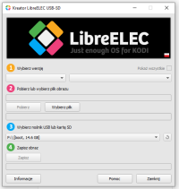 Do zainstalowania (wgrania obrazu) LibreELEC będziemy potrzebowali odpowiednich narzędzi. Pokażę, jak to zrobić w systemie Windows. W pierwszym kroku odwiedzamy stronę libreelec.tv/downloads i pobieramy LibreELEC USB-SD Creator dla systemu Windows. Po uruchomieniu pojawia się okno pokazane na rysunku 1.
