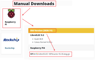 Powinniśmy w polu 1. móc wybrać wersje Rasberry Pi, a polu 2. wersję obrazu systemu i potem napęd, do którego jest podłączona karta SD. Na koniec w kroku 4 należy zapisać obraz. Plik obrazu trzeba pobrać ręcznie. Na tej samej stronie trzeba w sekcji Manual Download wybrać Raspberry Pi i pobrać odpowiedni obraz systemu – rysunek 2. Pierwszym moim wyborem była najnowsza stabilna wersja z marca 2022. Niestety z jakichś powodów w tej wersji nie mogłem potem zainstalować wtyczek do odtwarzania platform streamingowych. Po kilku nieudanych próbach zainstalowałem starsza wersję 9.2 i tu nie było tego problemu. Teraz w kroku 2. kreatora wybieramy lokację pobranego pliku i uruchamiamy zapis obrazu na sformatowanej karcie.