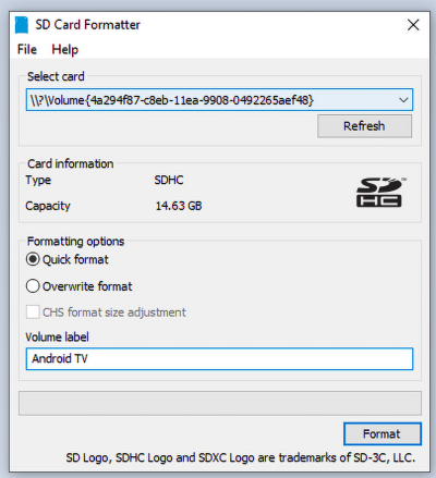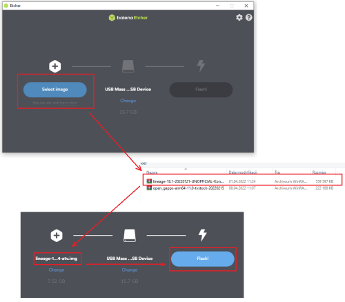 W kolejnym kroku trzeba zapisać obraz systemu na karcie SD. Do tego celu będziemy potrzebowali aplikacji BalenaEtcher w wersji portable dostępnej na stronie https://www.balena.io/etcher/. Wkładamy sformatowaną kartę do czytnika. Kartę można wcześniej sformatować za pomocą aplikacji SD Card Formatter – rysunek 4, która automatycznie wykrywa napęd z kartą SD i usuwa wszystkie ewentualne partycje. Otwieramy aplikację balenaEtcher, klikamy Select Image i wybieramy plik na przykład linage-18.1 dla Android TV 11 – rysunek 5.