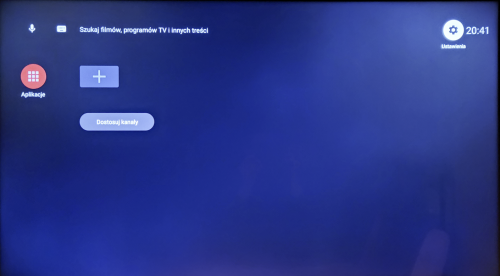 Kartę z obrazem systemu wkładamy do złącza Raspberry Pi 4, podłączamy komputerek do telewizora za pomocą kabla HDMI i włączamy zasilanie. System przy pierwszym uruchomieniu zgłasza się ekranem powitalnym – rysunek 7, a następnie prosi o ustawienie języka (dostępny polski), oraz strefy czasowej. Na rysunku 8 pokazano ekran po pierwszym uruchomieniu Android TV.