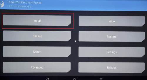Zależnie od systemu i kompilacji sposób wyboru zaawansowanych opcji restartu może się różnić i być może trzeba będzie trochę poszukać. Również ponowne uruchamianie jest równie nazywane, może to być reboot, lub restart. Tak czy inaczej musimy uruchomić ponowne uruchamianie z opcją odzyskiwania Recovery. Przy ponownym starcie systemu uruchomi się aplikacja Team Win Recovery Project. Z jej głównego okna wybieramy opcję Install – rysunek 13.