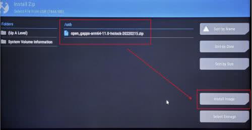 Na pendrive kopiujemy pobraną już wcześniej aplikację OpenGapps, wkładamy go do portu USB Raspberry Pi 4, klikamy na ikonę Select Storage i wybieramy „napęd” USB, a nim spakowany plik obrazu OpenGapps. Jeżeli wszystko jest gotowe to wybieramy ikonę Install Image – rysunek 14.