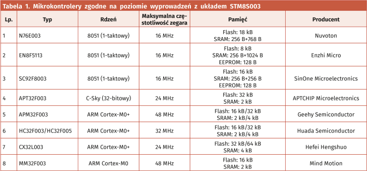 Układy te są produkowane przez firmę Huada Semiconductor. Należą one do bardzo szerokiej grupy układów scalonych wytwarzanych przez firmy dalekowschodnie, głównie chińskie, które są zgodne na poziomie wyprowadzeń z mikrokontrolerem typu STM8S003. Układy te są wyposażane w różne typy rdzeni, zarówno 8-bitowe, jak i 32-bitowe oraz bogate zestawy peryferii. Układy te nie są więc zgodne na poziomie kodu programu z mikrokontrolerem STM8S003. Z powodu firmowych układów peryferyjnych nie są one również zgodne programowo między sobą, nawet jeśli mają taki sam rdzeń. Zestawienie przykładowych układów należących do tej grupy zawiera tabela 1.