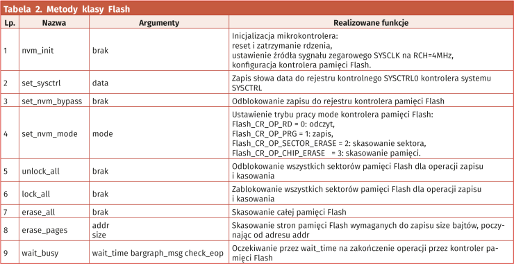 Sam zapis pamięci Flash jest realizowany słowo po słowie. Aby odbywał się on z największą możliwą prędkością, sterownik HC32F0, w zależności od liczby zapisywanych danych i ich położenia, dokonuje zapisu pamięci Flash słowem o długości 32-bitów (komenda _stlink.set_mem32(data_addr, data_block[:4])), 16-bitów (komenda _stlink.set_mem16(data_addr, data_block[:2])) albo 8-bitów (komenda _stlink.set_mem8(data_addr, data_block[:1])). W zasadzie można byłoby poprzestać tylko na zapisie słów o długości 8-bitów, co uprościłoby kod metody flash_write, jednak wydłużyłoby to czterokrotnie czas programowania. Zapis pamięci kończy się włączeniem ochrony wszystkich sektorów (komenda flash.lock_all()) i przełączeniem kontrolera pamięci Flash w tryb odczytu (komenda flash.set_nvm_mode(flash.Flash_CR_OP_RD)). Wszystkie metody obsługi pamięci Flash w mikrokontrolerze HC32F003/HC32F005 są zgrupowane w klasie Flash. Zestawiono je w tabeli 2.
