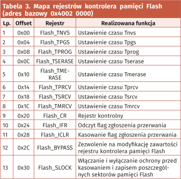 Sterownik HC32F0 wykonuje operacje na pamięci Flash mikrokontrolera za pośrednictwem jego kontrolera pamięci Flash, dokonując zapisu i odczytu odpowiednich rejestrów w kontrolerze. Mapę rejestrów kontrolera pamięci Flash w mikrokontrolerach HC32F003/HC32F005 zestawiono w tabeli 3.