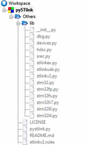 Projekt pyStlink jest dostępny do pobrania z repozytorium git znajdującego się pod adresem https://github.com/pavelrevak/pystlink. Strukturę projektu pokazuje rysunek 1.