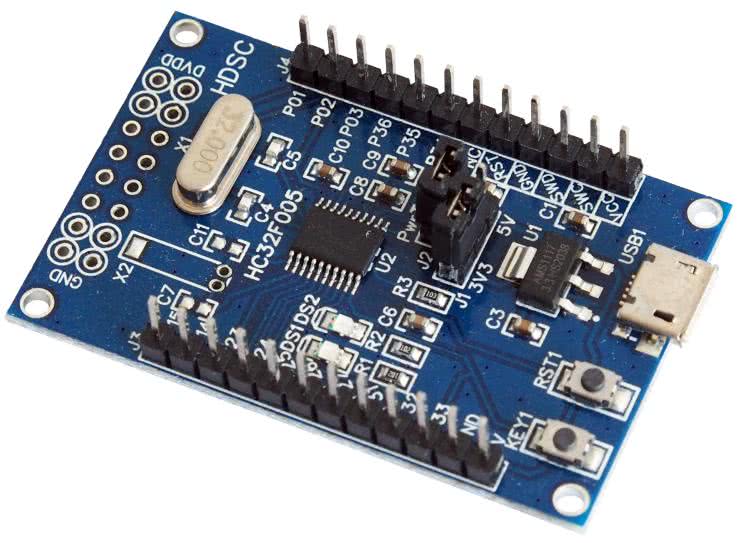 Oba układy zawierają ten sam zestaw identycznych peryferiów i różnią się jedynie rozmiarem zaimplementowanej pamięci. Układ HC32F003 jest wyposażony w 2 kB pamięci SRAM i 16 kB pamięci Flash, natomiast układ HC32F005 ma 4 kB pamięci SRAM i 32 kB pamięci Flash. Na portalach aukcyjnych dostępne są proste płytki uruchomieniowe do tych mikrokontrolerów (fotografia 1). Ich wyposażenie jest minimalistyczne. Poza mikrokontrolerem, stabilizatorem napięcia zasilania, rezonatorem kwarcowym i przyciskiem RESET płytki zawierają tylko jeden przycisk i jedną diodę LED, które są przeznaczone do użycia przez program użytkownika. Na płytce uruchomieniowej nie ma układu programatora. Co gorsza, układy HC32F003 i HC32F005 nie mają też fabrycznego bootloadera, przez co ich programowanie jest możliwe tylko przez interfejs SWD.