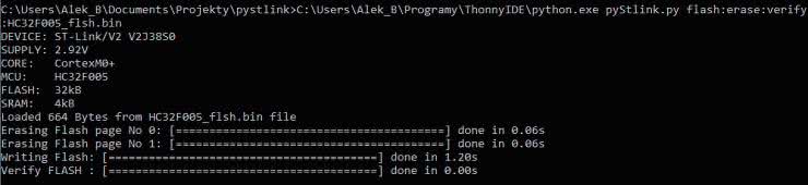 Rozbudowa programu pyStlink o obsługę mikrokontrolera nowego typu sprowadza się do dodania do listy DEVICES słownika z opisem mikrokontrolera oraz napisania sterownika pamięci Flash dla tego układu. W przypadku mikrokontrolerów HC32F003/HC32F005, słownik z ich opisem powinien znaleźć się na liście devices w słowniku zawierającym definicje układów o identyfikatorze rdzenia part_no równym 0xC60, tj. grupującym układy wyposażone w rdzeń Cortex-M0+.