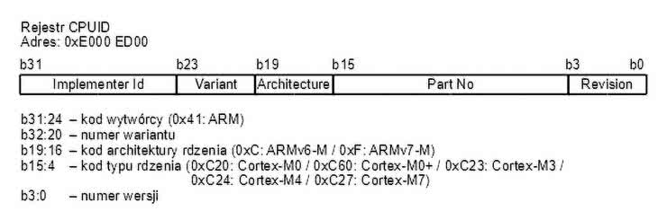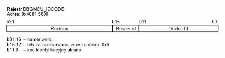 Po uruchomieniu program pyStlink w pierwszym kroku identyfikuje typ rdzenia podłączonego mikrokontrolera. W tym celu odczytuje z układu zawartość rejestru CPUID znajdującego się pod adresem 0xE000 ED00 i wydziela bity b15...b4 określające typ rdzenia (rysunek 3). Uzyskany identyfikator part_no służy do wyboru słownika z listy DEVICES obsługiwanych układów mających wykryty typ rdzenia. Następnie program pyStlink pobiera z wybranego słownika listę idcore_reg adresów, pod którymi należy poszukiwać rejestru zawierającego identyfikator dev_id układu. W przypadku mikrokontrolerów STM32 identyfikator układu zawarty jest w większości przypadków w rejestrze DBGMCU_IDCODE o adresie 0x4001 5800. Strukturę tego rejestru pokazuje rysunek 4. Bity b11...b0 zawierają poszukiwany identyfikator układu dev_id. Jest on używany przez program pyStlink do wyboru z listy devices słownika z definicjami typów mikrokontrolerów.