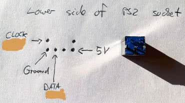 Podłączamy do niego zasilanie 3,3 V, GND oraz piny 2 i 5 modułu z mikrokontrolerem do strony 3,3 V konwertera poziomów. Podłączamy również linie 5 V i GND do strony 5 V konwertera poziomów. Następnie podłączamy gniazdo PS/2 tak, jak pokazano na rysunku 1. Pin zegara po prawej stronie gniazda przechodzi do pinu konwertera poziomu od strony 5 V, który trafia po drugiej stronie konwertera na pin 2 danych mikrokontrolera. Pin danych jest połączony z pinem 5 mikrokontrolera, oczywiście przez konwerter poziomów. Zasilanie i masa układu są oczywiście odpowiednio połączone.