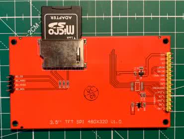 Moduł wyświetlacza ILI9488 został wyposażony w rząd pinów z tyłu (fotografia 1). Po prawej stronie znajdują się złącza zasilania, wyświetlacza i ekranu dotykowego (jeśli dany moduł posiada panel dotykowy). Po lewej stronie znajdują się 4 złącza do karty SD (patrz opis w dalszej części artykułu). W tym projekcie interfejs dotykowy nie jest używany.