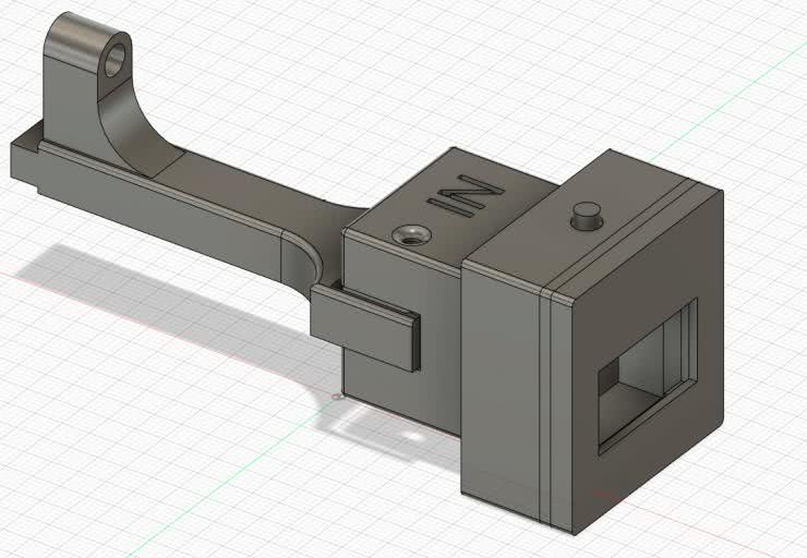 Elementy montażowe, załączone w projekcie, dostępne są w dwóch wersjach – przeznaczonej do drukarki Artillery x1, której używa autor oraz do Endera 3 v1, z uwagi na jego zawrotną popularność. Nic nie stoi na przeszkodzie, aby zaprojektować własny montaż do innej drukarki, jakiej używamy. Aby to uprościć, autor umieścił na stronie z projektem również plik Fusion360 z całym urządzeniem. Na rysunku 1 pokazano gotową, zmontowaną obudowę urządzenia w formie rzutu 3D z programu CAD. Widoczne jest miejsce na wyświetlacz, przycisk oraz wejście dla filamentu (opisane IN).