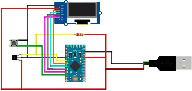 Elektronika w tym systemie jest dosyć prosta. Do modułu Arduino podłączony jest wyświetlacz OLED, przycisk i sensor Halla. Schemat układu pokazano na rysunku 3.
