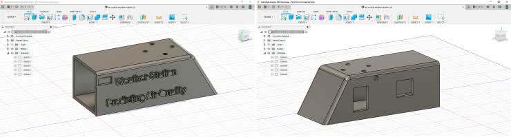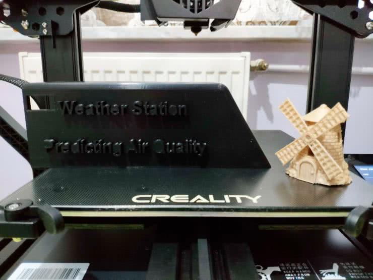 Obudowa została zaprojektowana w Autodesk Fusion 360. Można pobrać wynikowy plik STL ze strony z projektem. Projekt uzupełniony jest ozdobną figurką wiatraka, która powstała z elementów pobranych z Thingverse. Projekty zostały pocięte w Ultimaker Cura i wydrukowane z PLA z czarnego filamentu (obudowa) i filamentu z domieszką drewna (wiatrak). Wydrukowane elementy pokazano na fotografii 1. Wszystkie części zostały wydrukowane za pomocą drukarki 3D Creality CR-6 SE. Chociaż są to jedne z pierwszych wydruków, jakie autor wykonał, okazało się, że bez wielkiego wysiłku udało mu się osiągnąć bardzo zadowalający efekt.