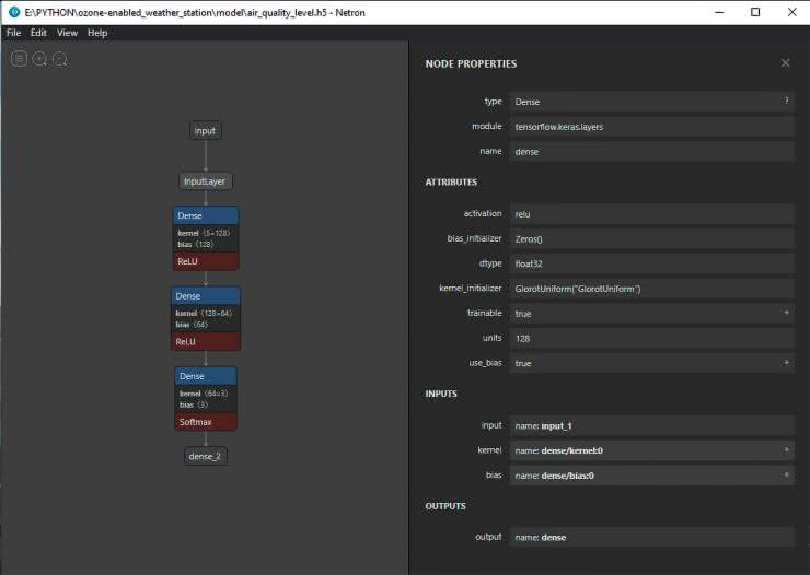 Model tej sieci wizualnie zaprezentowano na rysunku 3, pokazującym zrzut ekranu z aplikacji Netron, graficznego interfejsu do prezentacji sieci neuronowych różnego rodzaju. Wszystkie powyższe kroki realizowane są w skrypcie napisanym w Pythonie. Aplikacja ta składa się z trzech plików *.py i dwóch folderów. Wszystkie podstawowe operacje realizowane są w klasie Air_Quality_Level w pliku main.py.