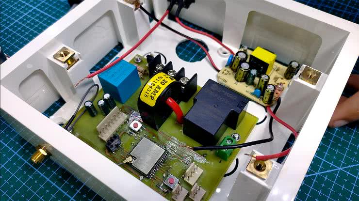 W obudowie umieszczono wszystkie komponenty wraz z zasilaczem 5 V, podłączonym do sieci 230 V. Przewód fazowy i neutralny podłączone są do zacisku śrubowego płytki drukowanej, a jeden przewód silnika przechodzi do normalnie rozwartego styku przekaźnika, drugi jest natomiast podłączony do przewodu neutralnego (fotografia 2).