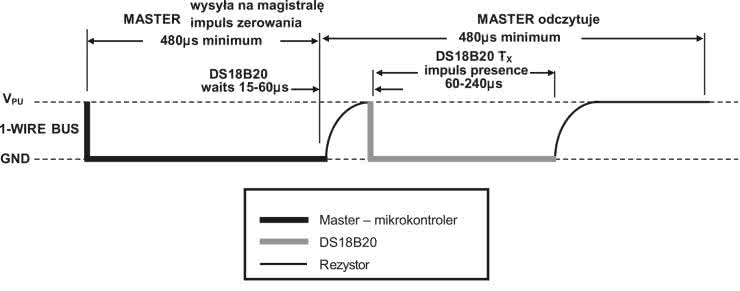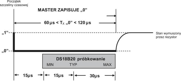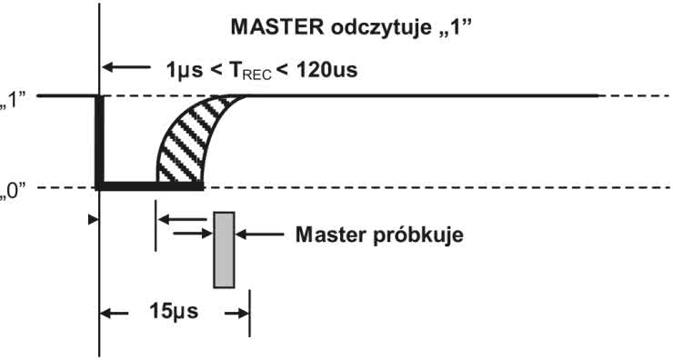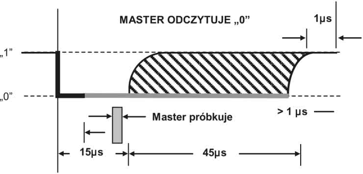 Odczytywanie danych rozpoczyna się od wymuszenia przez master na magistrali stanu niskiego przez minimum 1 μs. Dane wystawiane przez DS18B20 są prawidłowe przez maksymalnie 15 μs i przed upływem tego czasu mikrokontroler musi je przeczytać. Jeżeli na magistrali jest stan niski, to odczytane zostaje zero logiczne (rysunek 23), a jeżeli stan wysoki, to odczytana zostanie jedynka logiczna (rysunek 24).
