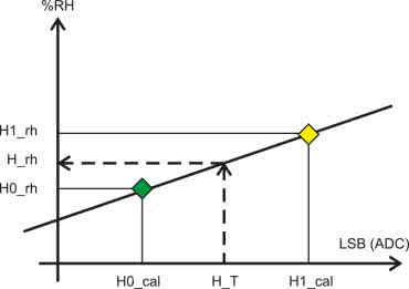 Te zmienne w połączeniu z 16-bitowymi danymi wyjściowymi będą służyły do wyliczenia mierzonej wartości. W przypadku temperatury wartości T0_cal, T1_cal, T0_degC i T1degC są współrzędnymi wyznaczającymi prostą kalibracji – zostało to pokazane na rysunku 17.
