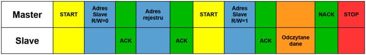 Podobnie jak w przypadku czujnika ciśnienia konfiguracja parametrów pracy i odczytywanie mierzonych wartości odbywa się przez zapisywanie i odczytywanie wewnętrznych rejestrów. Standardowo będziemy potrzebować dwu funkcji: odczytania zawartości rejestru o podanym adresie i zapisania rejestru o podanym adresie. Zapisanie rejestru rozpoczyna się od wysłania przez mikrokontroler sekwencji START, a po niej adresu Slave 0xBE. Potwierdzenia adresu przez HTS221 pozwala na wysłanie przez mikrokontroler adresu rejestru, a po nim zapisywanej danej (rysunek 15).
