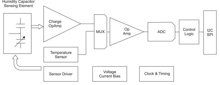 Podstawowym elementem toru pomiaru wilgotności jest sensor pojemnościowy. Jego pojemność zmienia się w zależności od wilgotności otoczenia. Konwersja zmiany pojemności na sygnał napięciowy jest wykonywana we wzmacniaczu Charge OpAmp. Sygnały napięciowe z tego wzmacniacza lub z czujnika napięciowego są konwertowane na postać cyfrową przez 16-bitowy przetwornik analogowo cyfrowy. Do komunikacji z mikrokontrolerem hostem może być zastosowany interfejs I²C lub SPI. My będziemy używać interfejsu I²C. Układ nie ma wyprowadzeń adresowych i 8-bitowy adres slave ma jedną wartość równą 0xBE dla zapisu danych i 0xBF dla odczytu danych.