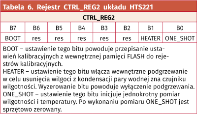 Po wyzwoleniu pomiaru, ale też w trybie pomiaru ciągłego trzeba testować, czy wynik pomiaru został zapisany do rejestrów wyjściowych. Żeby to zrobić należy odczytać zawartość rejestru statusowego STATUS_REG. Ustawienie bitu H_DA (bit b1 STATUS_REG) oznacza, że wynik pomiaru wilgotności został zapisany do rejestrów wyjściowych HUMIDITY_OUT_L i HUMIDITY_OUT_H, a ustawienie bitu T_DA ( bit b0 STATUS_REG) oznacza, że wynik pomiaru temperatury został wpisany do rejestrów pomiaru temperatury. W czasie testów czujnika skonfigurowałem układ do pracy z wyzwalaniem na żądanie i z ustawionym bitem BDU. Procedura inicjalizacyjna została pokazana na listingu 13.