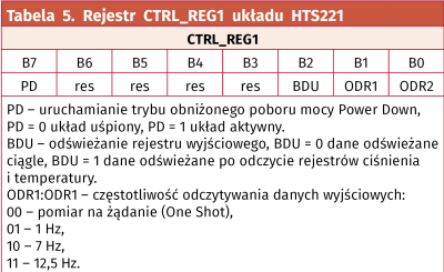 Pomiary wilgotności i temperatury mogą być wykonywane na żądanie, po wysłaniu polecenia (one shot), lub w sposób ciągły z określoną częstotliwością. Do programowania częstotliwości pomiarów jest przeznaczony rejestr CTRL_REG1 o adresie 0x20 opisany dokładnie w tabeli 5. Bit PD tego rejestru jest przeznaczony do wprowadzania układu w stan obniżonego poboru mocy, a bit BDU określa czy rejestr z danymi wyjściowymi wilgotności i temperatury ma być odświeżany automatycznie po wykonaniu pomiarów, czy tez po odczytaniu przez mikrokontroler 8 starszych bitów wyniku poprzedniego pomiaru. Po włączeniu zasilania bit PD jest wyzerowany i żeby można było wykonywać pomiary należy do PD wpisać jedynkę.