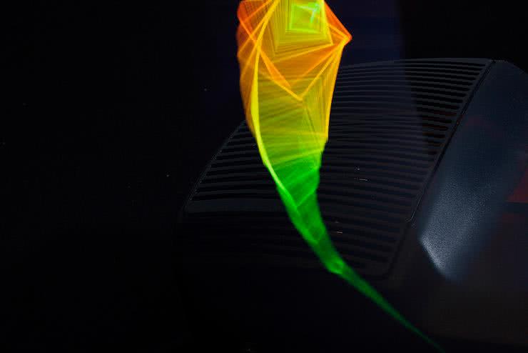 „Kilka innych projektów również zainspirowało wizualizacje, które chcę wykonać w ramach tej pracy” dodaje Hill. Wskazuje on na projekty takie, jak mierzący pole elektromagnetyczne (EMF) Light Paintings autorstwa Luka Sturgeona i Shamika Raya (fotografia 2) oraz obrazy świetlne autorstwa Anthonego Devincenziego (fotografia 3) wizualizujące pole wokół urządzeń codziennego użytku.