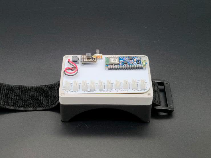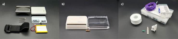 Główna płytka z elektroniką jest instalowana w plastikowej obudowie, wraz z baterią, włącznikiem itp. Pliki, potrzebne do druku plastikowych elementów obudowy, dostępne są na stronie z projektem w portalu Instructables. Moduł ten montowany jest na nadgarstku za pomocą paska z rzepem. Zmontowany moduł, bez zamkniętej obudowy, pokazano na fotografii 5.