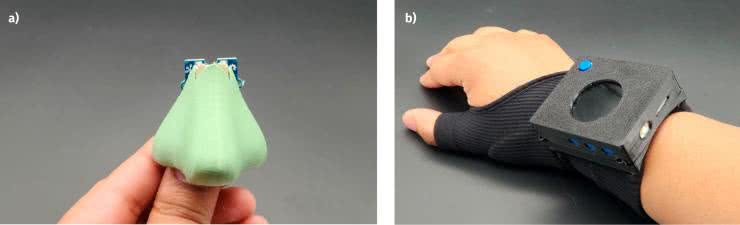 Sensor umieszczony są w wydrukowanym w 3D, plastikowym… nosie (patrz fotografia 9a). Połączony jest on przewodem z modułem Wio Terminal, jaki umieszczono na elastycznym pasku na nadgarstku. Ekran urządzenia jest w większości zakryty, pozostawione jest tylko okrągłe wycięcie (fotogtrafia 9b). Koresponduje ono z kolorowym okręgiem, jaki wyświetlany jest na ekranie w czasie pracy.