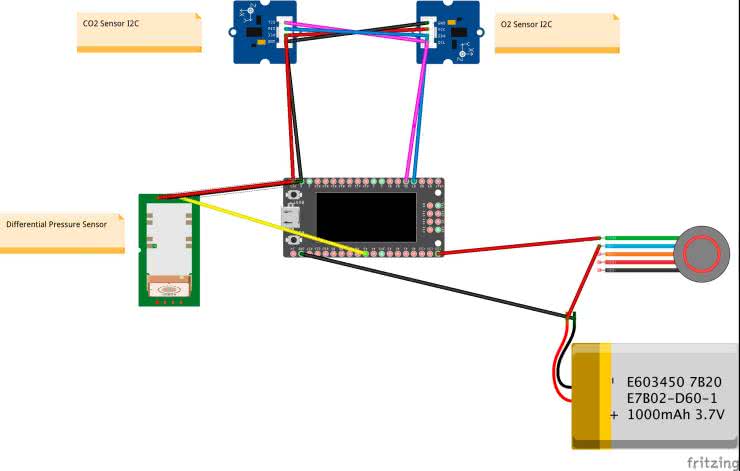 Moduł bazuje częściowo na innym projekcie - spirometrze z druku 3D (linki na końcu artykułu). Instrukcja jego montażu itp. może być pomocna w zakresie budowy tego układu.