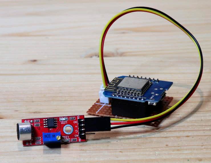 Aby przekształcić moduły w gotowe urządzenie, w coś, co bardziej przypomina gotowy produkt, autor zamontował moduł z ESP8266 na płytce uniwersalnej, która została docięta do wymiarów modułu. Do płytki dolutowano gniazdko JST, do którego podłączony jest przewód do modułu z mikrofonem. Aby podłączyć mikrofon trzeba dobrać przewód, który ma zwykłe gniazdka na goldpiny na jednym końcu i złącze JST na drugim.