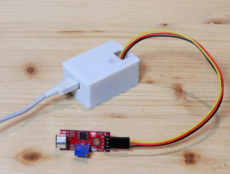 Autor zaprojektował również obudowę do tego urządzenia. Wykonana jest ona w technologii druku 3D i mieści w sobie moduł Wemos D1 na płytce uniwersalnej. W pokrywie obudowy przygotowane jest miejsce do wykonania otworu dla przewodów biegnących do mikrofonu. Przewidziano także miejsce na port USB.