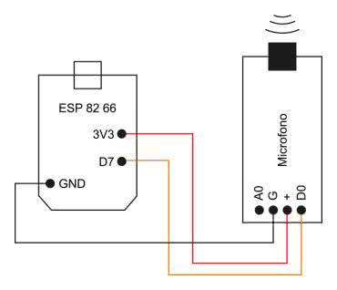 Płytkę mikrofonu podłączamy do modułu z ESP8266 zgodnie ze schematem pokazanym na rysunku 1. Zasilanie i masę z modułu z ESP8266 podłączamy do zasilania modułu z mikrofonem. Wyjście cyfrowe mikrofonu podłączone jest do wyprowadzenia D7 modułu ESP8266. Finalne strojenie mikrofonu musimy zrealizować po zainstalowaniu oprogramowania na mikrokontrolerze. Poziom wyzwalania mikrofonu ustawiamy tak, aby był on każdorazowo wyzwalany dźwiękiem mikrofonu, ale aby żadne inne dźwięki w mieszkaniu nie wyzwalały fałszywych detekcji.