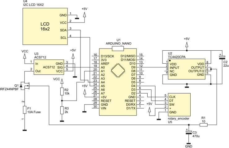Znajdujący się dalej tranzystor Q3 pełni kluczową rolę w pracy urządzenia. Jest on sterowany przez driver bramki TC4420 (U2), który jest kontrolowany przez mikrokontroler. Arduino steruje układem za pomocą przebiegu PWM tak, aby prąd (mierzony za pomocą układu ACS712) lub moc (obliczana z płynącego prądu i napięcia VCC mierzonego za pomocą dzielnika R2/R3 i wejścia analogowego A1) była zgodna z zadaną.