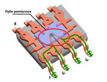 W torze sygnałowym obciążenia znajdują się trzy elementy, umieszczone pomiędzy linią VCC, a masą układu. Rozpoczynając od dodatniego bieguna zasilania, prąd przechodzi przez układ ACS712 (U3 na schemacie na rysunku 1), a następnie przez tranzystor Q1 i bezpiecznik F1. Sensor ACS712 firmy Allegro to w pełni zintegrowany sensor do pomiaru prądu, który bazuje na czujniku Halla. Układ ten mierzy płynący prąd poprzez pomiar pola magnetycznego wokół przewodnika (znajdującego się we wnętrzu obudowy scalonego sensora - rysunek 2), co gwarantuje niską rezystancję elementu pomiarowego (niski spadek napięcia, a co za tym idzie niewielkie straty mocy) oraz izolację galwaniczną pomiędzy układem pomiarowym, a torem prądu. Układ ten ma wyjście analogowe, które podłączone jest do wejścia przetwornika analogowo-cyfrowego modułu Arduino.