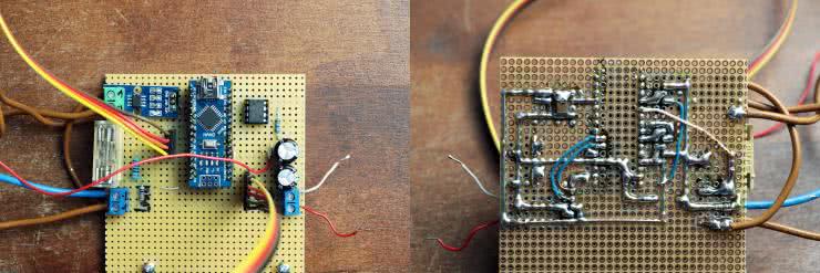 Autor zmontował układ na płytce uniwersalnej, korzystając z gotowych modułów, które wystarczyło tylko połączyć. Gotową, polutowaną płytkę z modułami pokazano na fotografii 1.