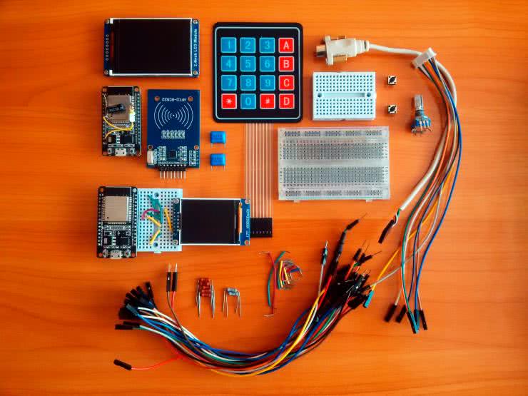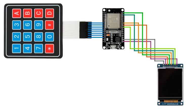 Odbiornik jest konstrukcją jeszcze prostszą niż sam magazyn. Na rysunku 6 pokazano schemat tego modułu. Składa się on z wyświetlacza i prostej klawiatury membranowej, podłączonych do modułu z układem ESP32.