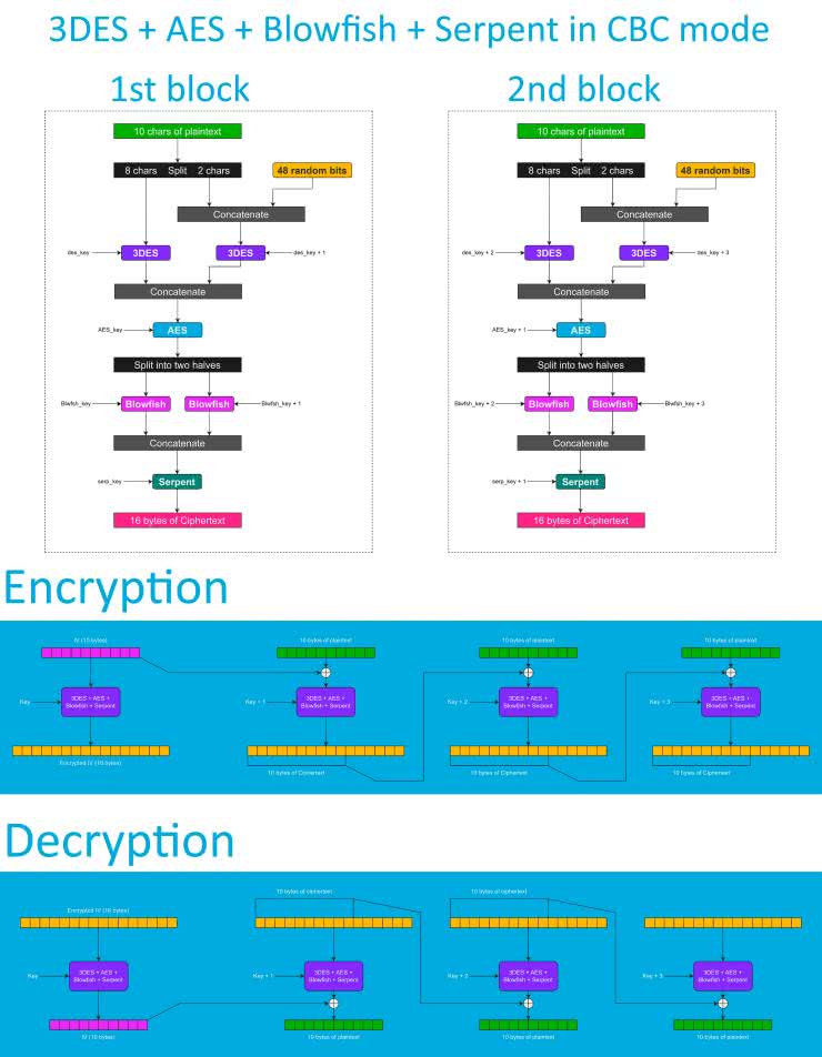 Do szyfrowania zapisywanych danych opisana konstrukcja używa szeregu algorytmów kryptograficznych, co ma zapewnić zwiększenie poziomu bezpieczeństwa - nawet gdyby okazało się, że któryś z algorytmów został złamany, to dane zapisane w systemie nadal pozostaną bezpieczne. Na rysunku 1 pokazano schematycznie zastosowane algorytmy szyfrowania. Powstało złożenie czterech algorytmów kodowania - 3DES, AES, Blowfish i Serpent. Dodatkowo algorytm pracuje w tzw. trybie CBC, czyli trybie wiązania bloków zaszyfrowanych. Szyfrowany tekst jest dzielony na bloki, w tym przypadku po 10 znaków i szyfrowany w taki sposób, że kolejne bloki wiązane są ze sobą za pomocą sprzężenia zwrotnego.