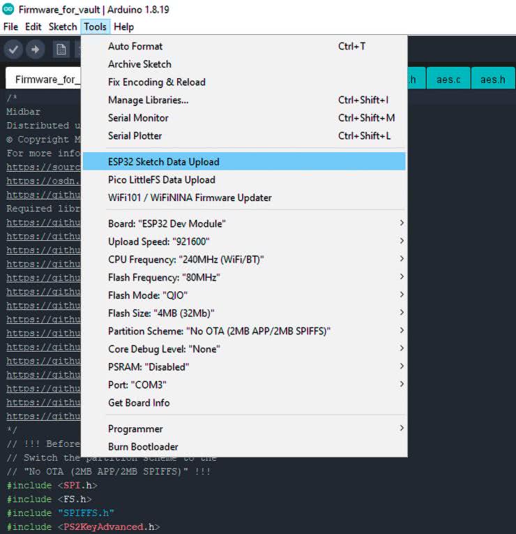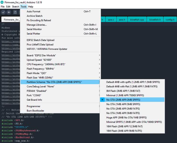 Teraz mamy dostęp do narzędzi systemu plików. W menu (rysunek 2) wybieramy opcję No OTA (2MB APP/2MB SPIFFS), zanim będziemy kontynuować pracę z ESP32. Wybór tej opcji jest konieczny, ponieważ firmware magazynu haseł jest zbyt duże, aby zmieściło się w pamięci układu wraz z domyślną partycją.