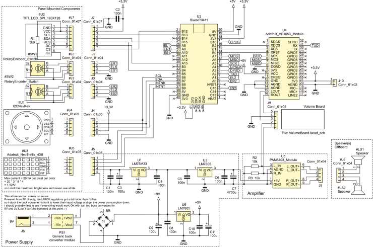 W pierwszej kolejności należy przeanalizować działanie sekcji zasilania, pomimo, że autor zaprojektował tę sekcję jako ostatnią. W pierwszej kolejności chciał zastosować stabilizatory liniowe (7805 i 78M33), ale odkrył, że robią się one zbyt gorące, gdy są zasilane z zasilacza 9 V (typowy zasilacz dla efektów gitarowych). Dlatego też umieścił przed sekcją stabilizatorów liniowych dodatkową przetwornicę buck, aby zmniejszyć napięcie wejściowe dla stabilizatorów. Dodatkowo, przed przetwornicą można umieścić jeszcze mostek prostowniczy, co pozwoli zabezpieczyć układ przed np. odwrotnym podłączeniem zasilania.