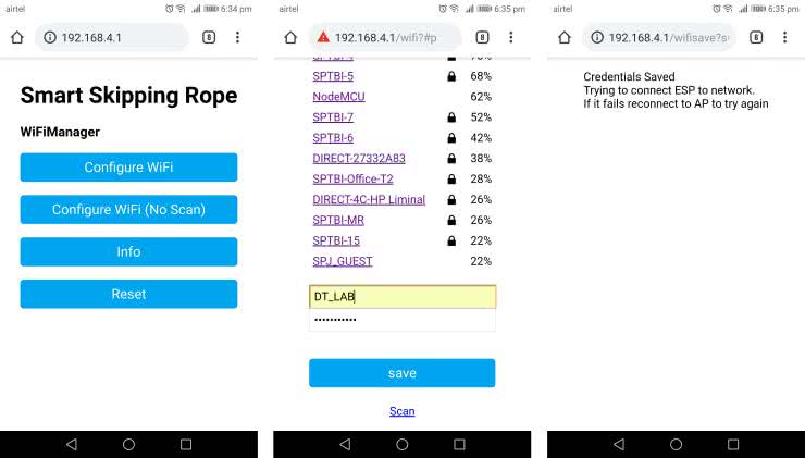Po włączeniu trzeba podłączyć mikrokontroler do sieci Wi-Fi. Aby połączyć go z siecią bezprzewodową, można użyć telefonu komórkowego lub laptopa, aby połączyć się ze skakanką, która początkowo uruchamia własny AP do konfiguracji. Następnie otwieramy przeglądarkę i wpisujemy następujący adres IP: 192.168.4.1. Spowoduje to załadowanie następnej strony internetowej, na której możesz ustawić dane uwierzytelniające do sieci Wi-Fi (rysunek 2). Teraz można połączyć inteligentną skakankę z siecią Wi-Fi za pomocą tej strony.