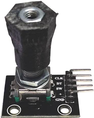 Enkoder obrotowy służy do zliczania skoków. Jest również znany jako enkoder kwadraturowy lub względny enkoder obrotowy. Jego wyjściem jest seria impulsów prostokątnych na dwóch wyjściach układu. Z różnicy faz pomiędzy tymi dwoma przebiegami odczytać można kierunek obrotów, a z częstotliwości impulsów liczbę obrotów. Przed wlutowaniem w płytkę należy włożyć element encoder_knob do enkodera obrotowego i włożyć tam nakrętkę M4, jak pokazano na fotografii 3.