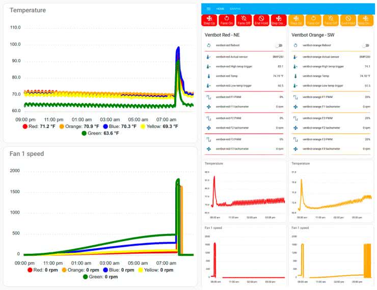 Opisanie, jak to skonfigurować, wykracza poza zakres tego artykułu. Przykład tego, co da się zrobić, pokazano na rysunku 5. Wykresy te pozwalają na monitorowanie zmian w czasie. Dodatkowo serwer Home Assistant, wiedząc, kiedy działa ogrzewanie lub chłodzenie (i kilka innych rzeczy) może lepiej sterować Ventbotami. Zamiast używać czujników temperatury podłączonych do Ventbotów, można użyć jego wiedzy o tym, kiedy włączone jest ogrzewanie lub chłodzenie, aby nakazać uruchamianie i zatrzymywanie wentylatorów.