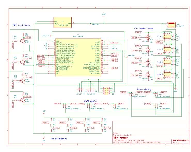 Na rysunku 2 pokazano schemat ideowy modułu. Budowa układu jest bardzo prosta. Centralnym elementem jest moduł z ESP32, do którego podłączone są wszystkie wejścia i wyjścia. Mikrokontroler mierzy parametry otoczenia poprzez sensor podłączony przez I²C i zadaje wartości prędkości obrotowej wentylatorom. ESP32 mierzy też prędkość, jaką raportują poszczególne wentylatory, aby raportować ją do systemu i monitorować ich pracę.
